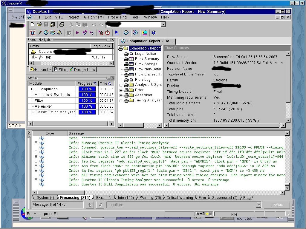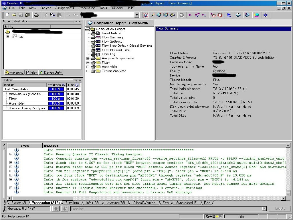 参考:Pentium 4 3GHz,メモリ1GB,XP Pro,Quartus II 7.2 Web Editionでの結果(ライセ ンスにはWeb Licenseを使用しているた めライセンスサーバにアクセスし たら本当はあと一分くらいかかる )