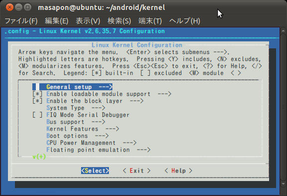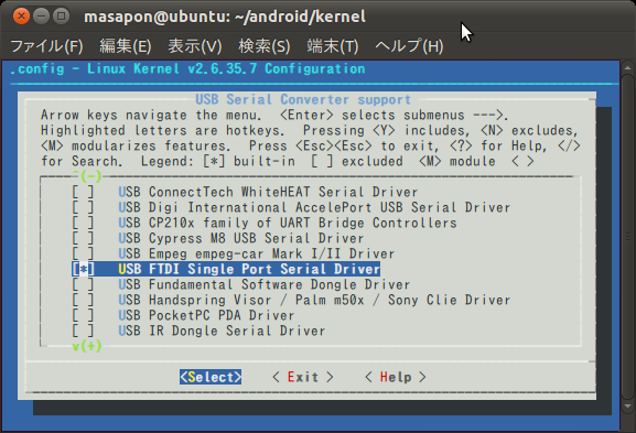 masapon@ubuntu:~/android/kernel$ make ARCH=arm CROSS_COMPILE=arm-none-eabi- menuconfig[Device Drivers]⇒[USB support]⇒[USB Serial Converter support]⇒[USB FTDI Single Port Serial Driver]